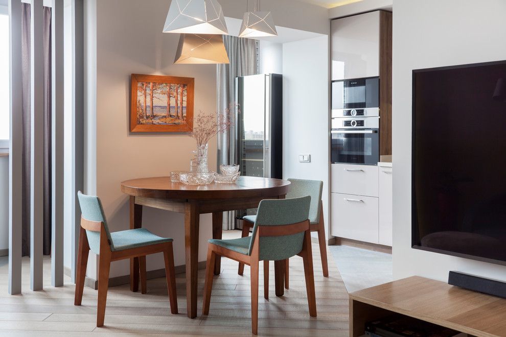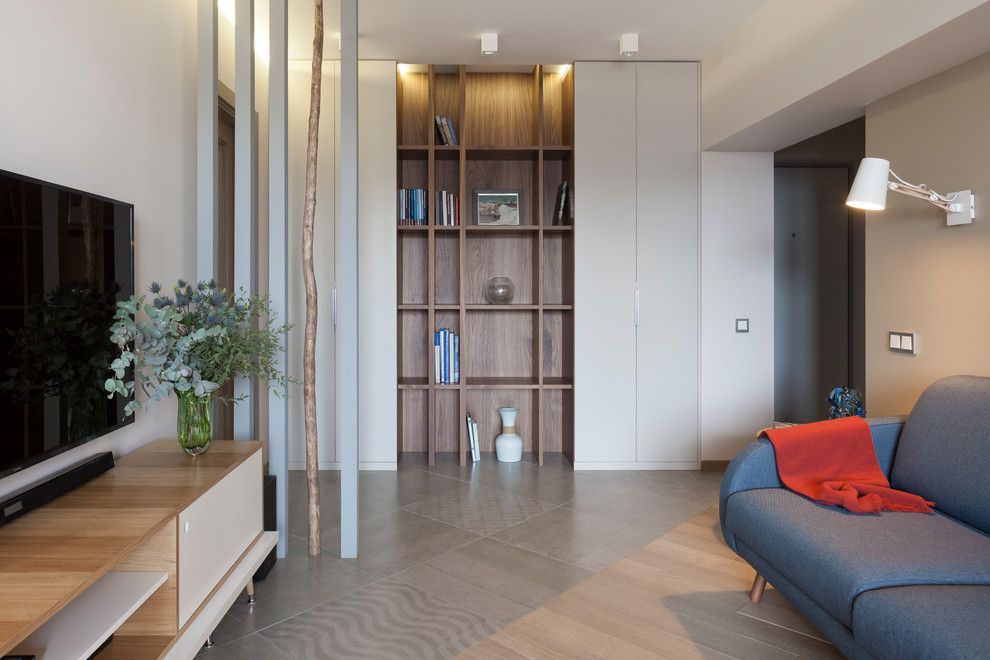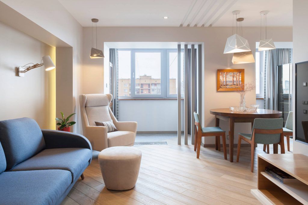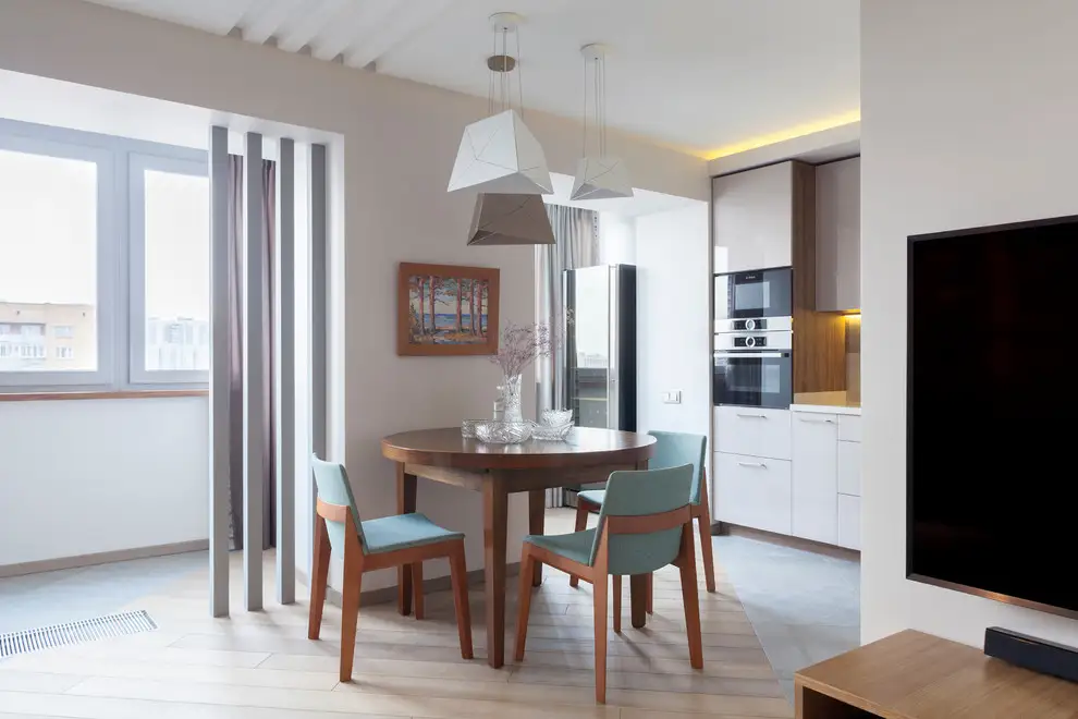 Pentru a reusi acest lucru, peretele dintre bucatarie si living a fost eliminat; designerii au ales o abordare ingenioasa prin care sa marcheze acest detaliu sau mai bine zis, lipsa lui: prin 4 lamele pozitionate de o parte si cealalta a camerei. Efectul per ansamblu este surprinzator!
