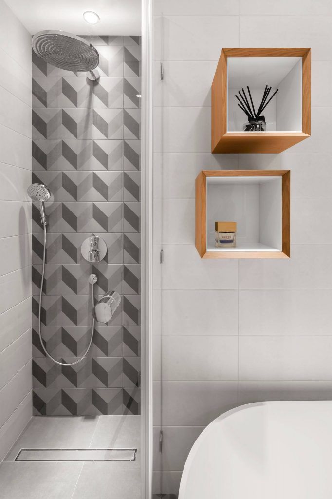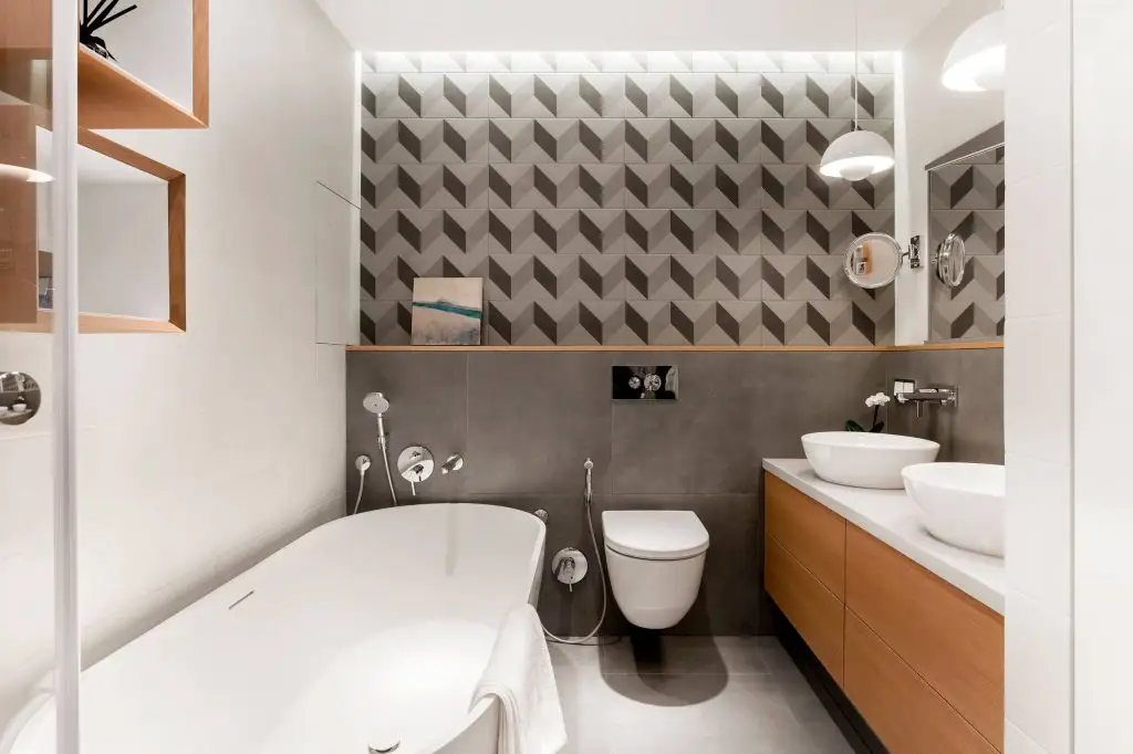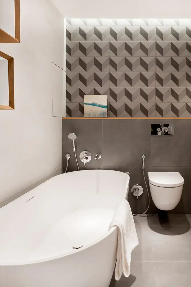 Jocul geometriilor este reluat si in baie prin placi de faianta ce creeaza un efect tridimensional. Cele 2 lavoare, cada si cabina de dus asigura un confort necesar pentru ambii parteneri. Excelenta propunere de amenajare, mai ales cand si spatiul permite o astfel de abordare!