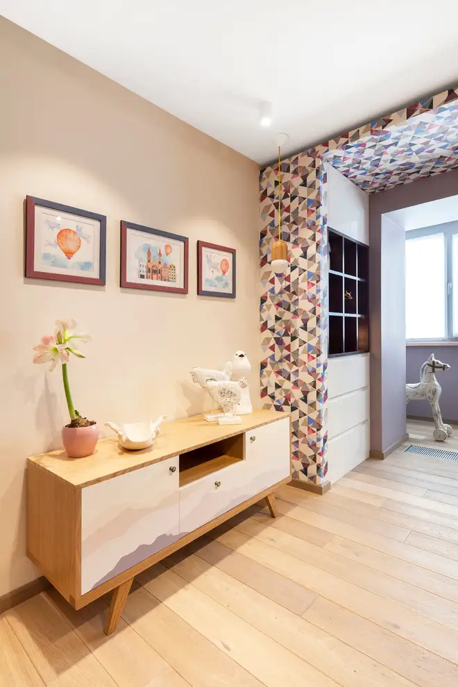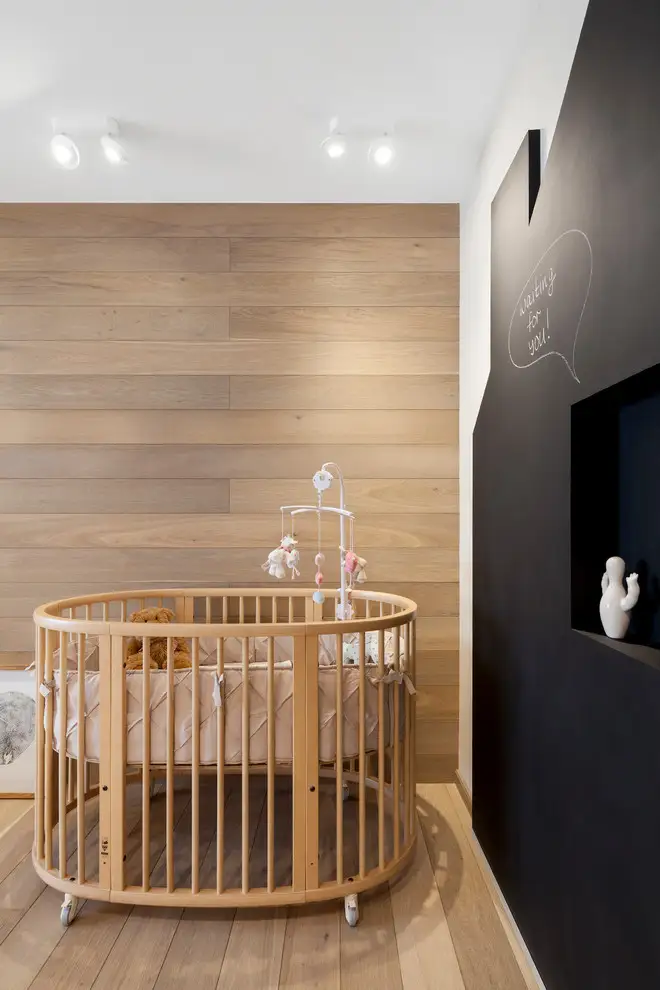 Beneficiarii acestei amenajari de apartament sunt o familie tanara ce asteapta un bebelus. Astfel, designerii au ales sa contureze intr-un mod foarte placut camera viitorului membru al familiei. Chiar la intrarea in camera, peretele este placat cu o forma ce imita o casuta; fiind vopsit cu vopsea neagra de tabla scolara, copilul va putea scrie nestingherit pe ea.
