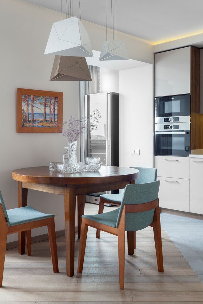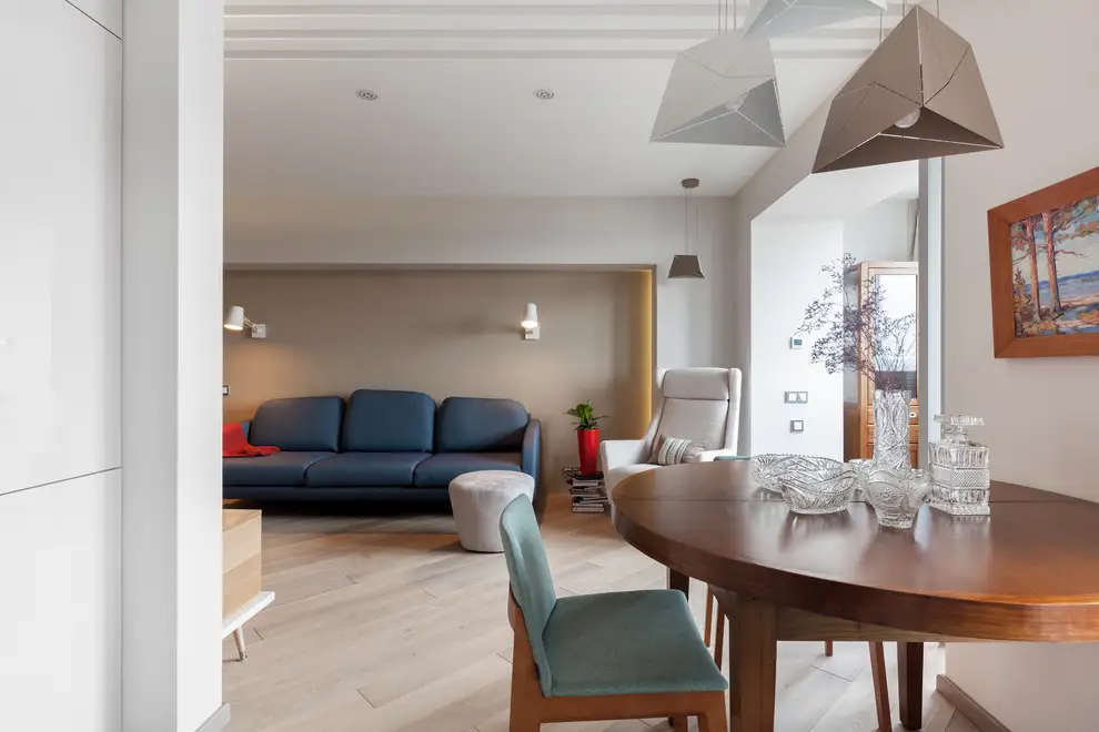 Cateva piese ne-au atras atentia. Canapeaua albastra, corpurile de iluminat suspendate si biblioteca incastrata. Simtim usoare influente retro in designul canapelei, al consolei de sub televizor sau al mesei cu scaunele aferente. Cu toate acestea, discursul general este unul contemporan, cu o amenajare aerisita, minimala care nu incarca inutil decorul.