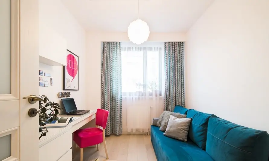 Cel de-al doilea dormitor este amenajat ca un spatiu de lucru cu birou si o canapea confortabila. Accentele cromatice de albastru si fucsia reiau motivul culorilor redat sub diferite forme in aceasta amenajare.