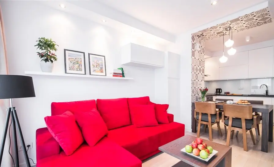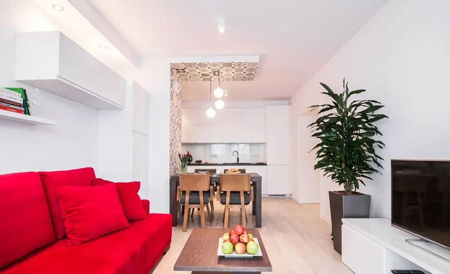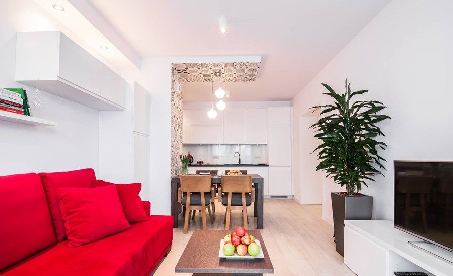 Zona livingului te incarca cu energie doar privind fotografiile. Pe un fundal predominant alb, rosul canapelei iese in evidenta, fiind practic elementul de accent care impacteaza intreaga incapere. Si putinele piese de mobilier existente au fost alese tot albe. Spatiul destinat camerei de zi este restrans, avand o configuratie lunga si ingusta.