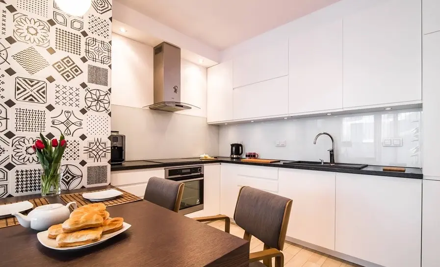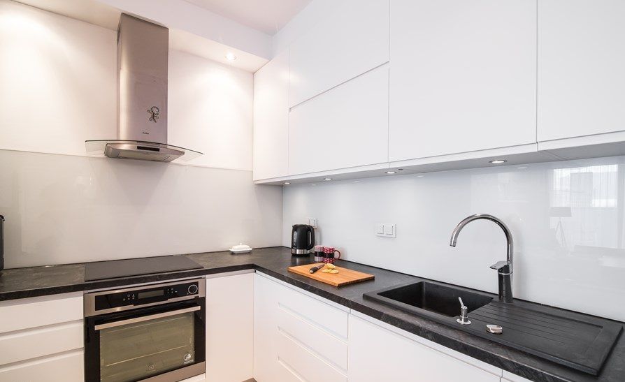 Amenajarea bucatariei urmeaza un design modern, simplu. Dulapurile compacte, fronturi albe, lucioase, manere frezate si un blat negru, precum si electrocasnice incorporate, iata pe scurt o bucatarie unitara, dotata cu cele necesare, atat in dotari, cat si in materie de depozitare.