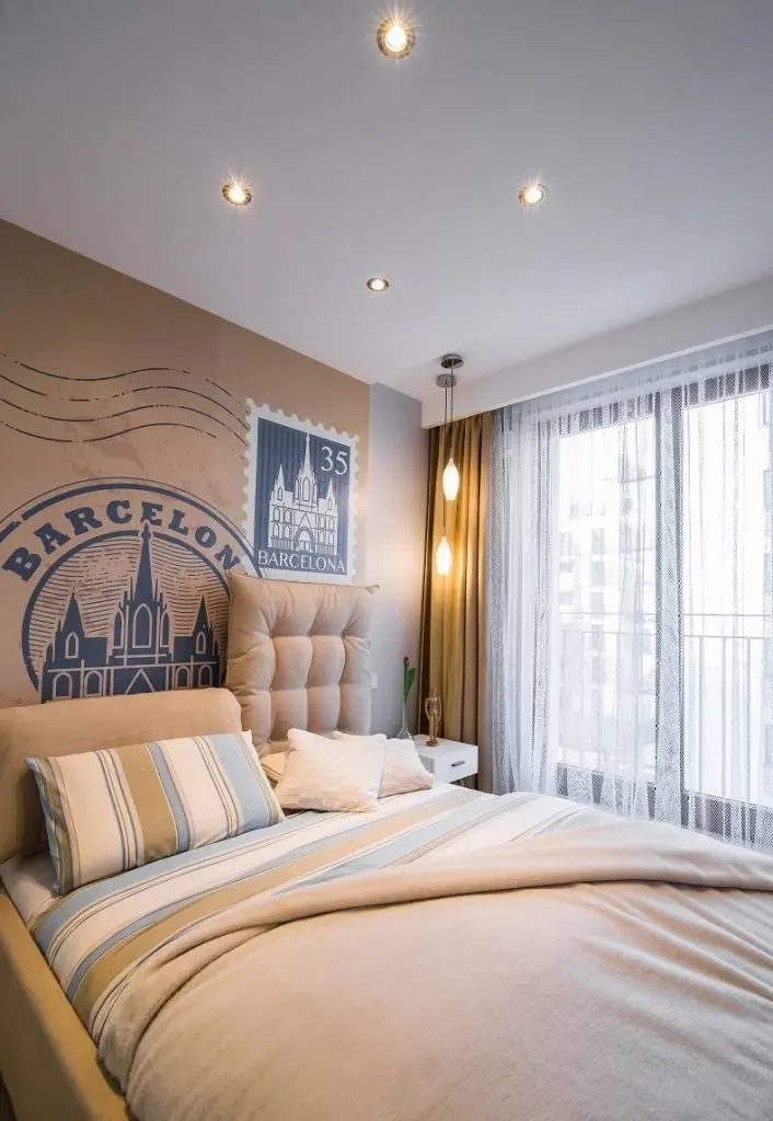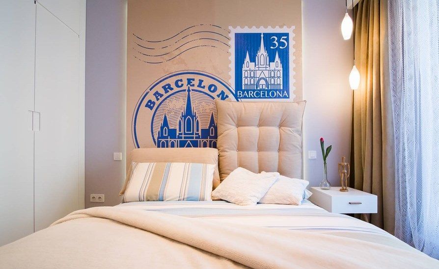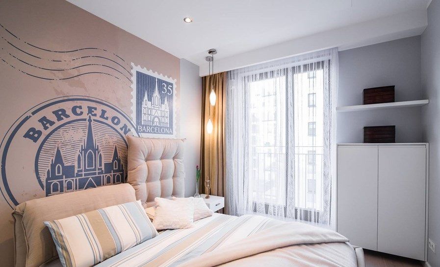Mergem spre dormitorul matrimonial. Daca ar fi sa ne intrebi care este camera preferata, acest dormitor ar castiga detasat. Peretele-accent cu fototapetul ce reprezinta o carte postala este genial! Doua perne mari, tapitate joaca rol de tablie, sporind astfel confortul cand stai in pat si vrei sa te sprijini.