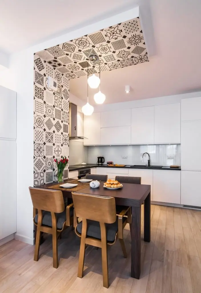 Bucataria este una in plan deschis, zona de luat masa fiind practic delimitarea dintre cele doua functiuni, living si bucatarie. Pentru a marca aceasta trecere, dar si pentru a o pune in valoare, designerii au mizat pe o zona-accent cu placi decorative care se prelungesc pana in tavan.