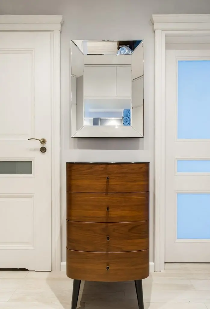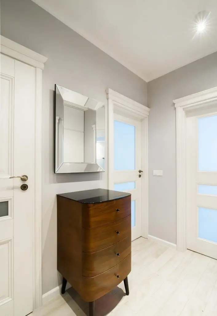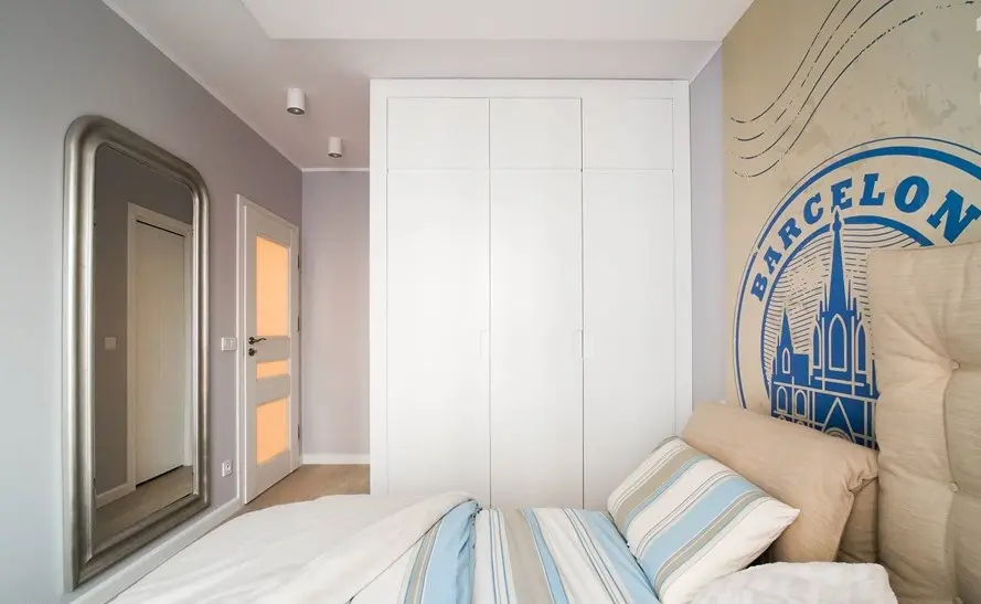 Camera este mica, dar bine optimizata pentru un pat confortabil, dulapuri pentru haine si o oglinda mare care pacaleste ochiul si iti lasa impresia ca incaperea este de fapt mai mare. Pentru un plus de depozitare, langa fereastra a fost amenajat un dulap de inaltime medie si o etajera.