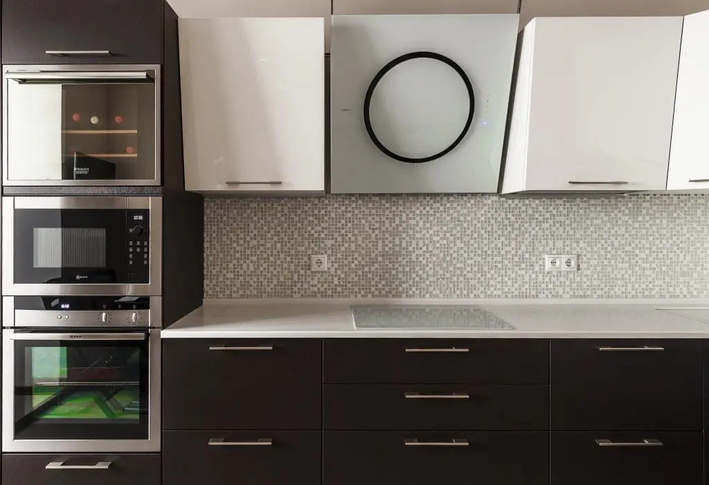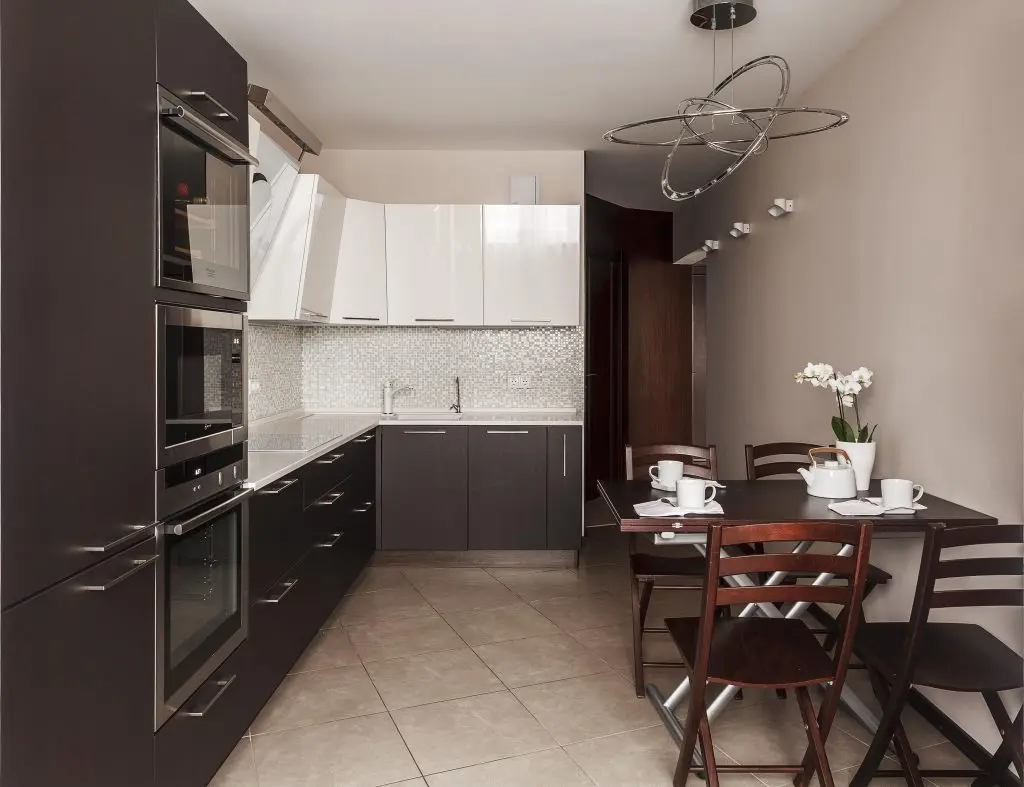 Bucataria este dispusa pe doua randuri, avand disponibile toate electrocasnicele necesare. Partea superioara a mobilierului de bucatarie este facut la comanda intr-un stil asimetric, avand corespondent in mobilierul pentru T V din camera de zi. In imediata apropiere a bucatariei a fost amenajat un spatiu pentru masa si un colt de relaxare destinat diminetilor pe care gazda le va petrece aici.