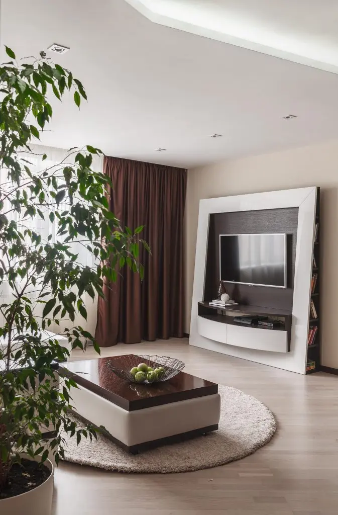In zona de zi, accentul vizual cade asupra covorului rotund cu aspect moale din centrul camerei care indulceste abundenta formelor drepte ale mobilierului. Beneficiara iubeste plantele verzi, asa ca acestea si-au facut loc in amenajare pentru a-i oferi prospetimea dorita.