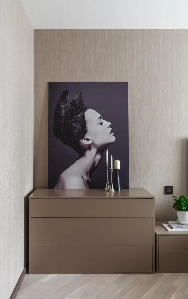 Dormitorul asigura piesele de mobilier necesare pentru minimul de confort: un pat, doua noptiere, o comoda si un dulap incastrat cu oglinzi montate pe usile glisante. Lebada neagra pozitionata pe comoda imprima eleganta si gratiozitate zonei destinate somnului. Spatiul este invadat de o cantitate generoasa de lumina naturala care amplifica efectul de spatialitate.