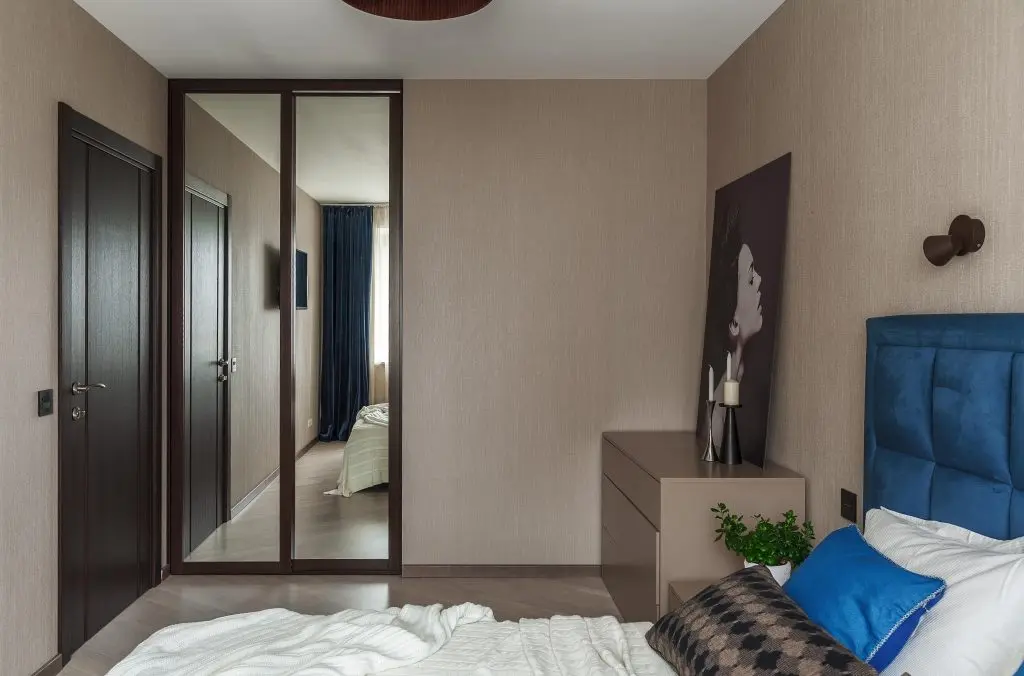 Vedetele acestui apartament au fost construite prin contraste puternice. Dormitorul se remarca datorita tabliei de pat in aceeasi culoare cu draperiile si pernele decorative: un albastru stralucitor, de inspiratie marina.