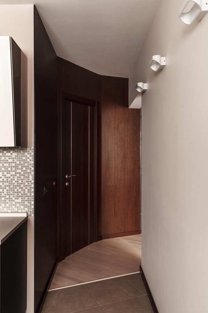 Trecerea din bucatarie spre zona de zi s-a facut in mod armonios, in acest caz fara a sparge paleta cromatica dominanta. Piesele de mobilier se inlantuiesc, iar holul este cel care desparte cele doua functiuni realizand in acelasi timp legatura dintre acestea. Holul serveste si ca un spatiu masiv pentru depozitare, aici fiind montate ma multe dulapuri incastrate.