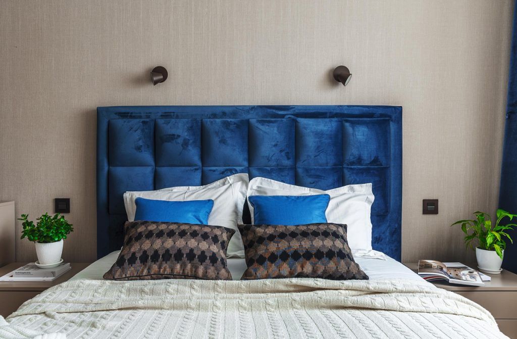 Vedetele acestui apartament au fost construite prin contraste puternice. Dormitorul se remarca datorita tabliei de pat in aceeasi culoare cu draperiile si pernele decorative: un albastru stralucitor, de inspiratie marina.