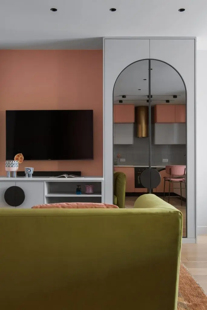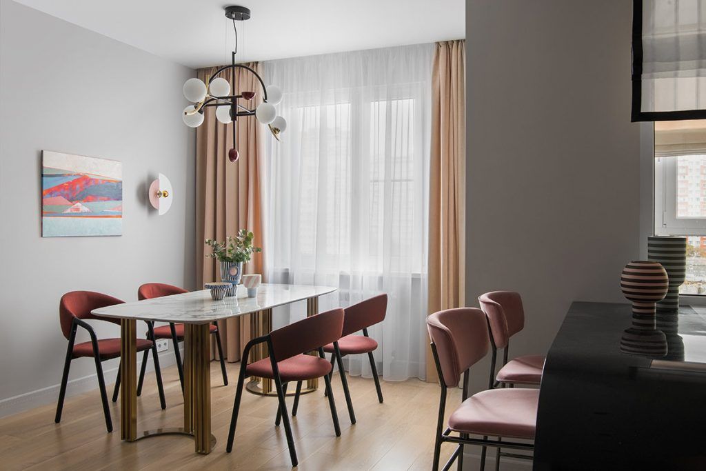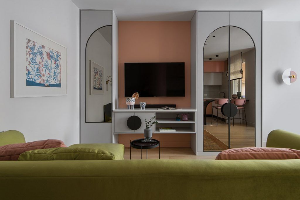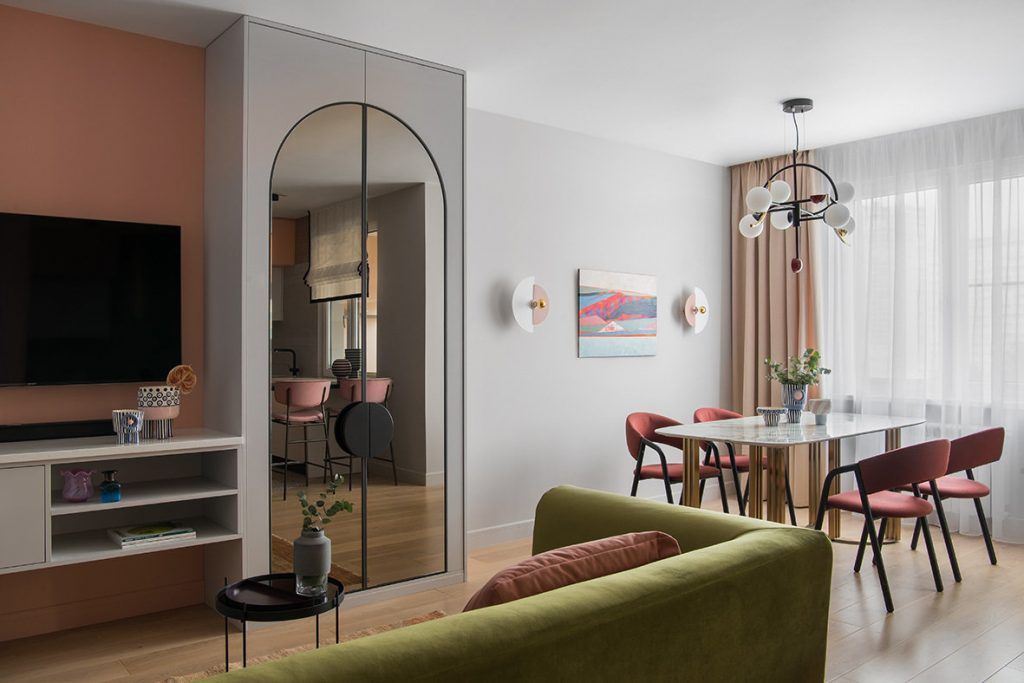 Amenajarea acestui apartament de doua camere din Shchelkovo iese in evidenta prin bucataria de mare impact vizual, laitmotivul arcelor (prezente in toate zonele locuintei), solutiile si generozitatea spatiilor de depozitare. Atmosfera moderna, tinereasca si proaspata se resimte inca de la intrarea in locuinta recent amenajata pentru o clienta vesela, optimista, dedicata lumii finantelor. Putem regasi usor o parte din trasaturile de caracter ale beneficiarului in expresia stilistica a amenajarii.