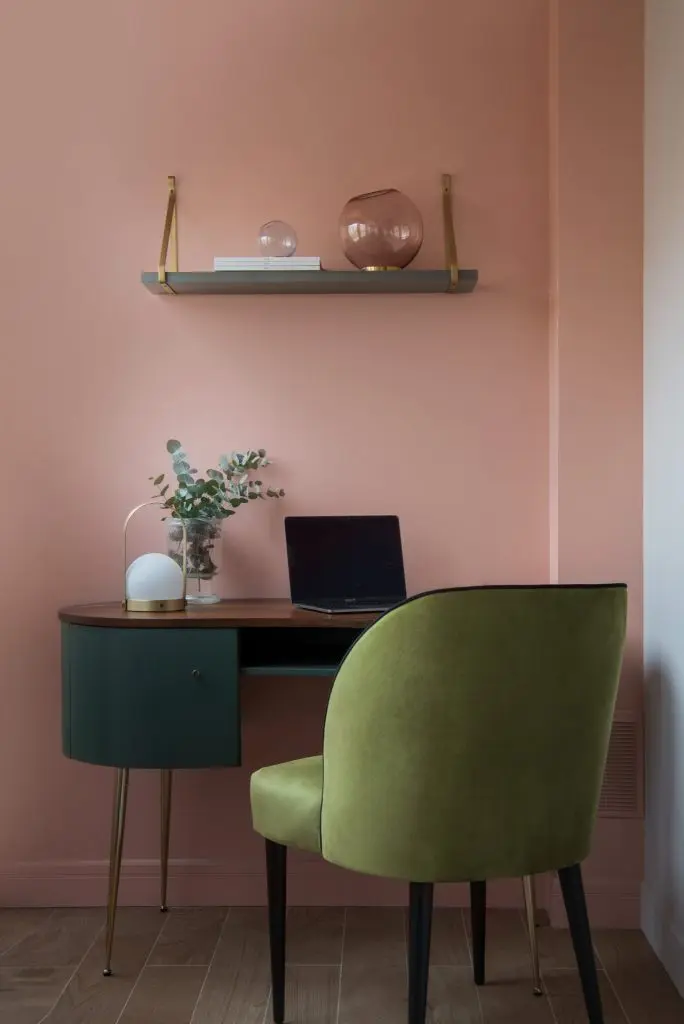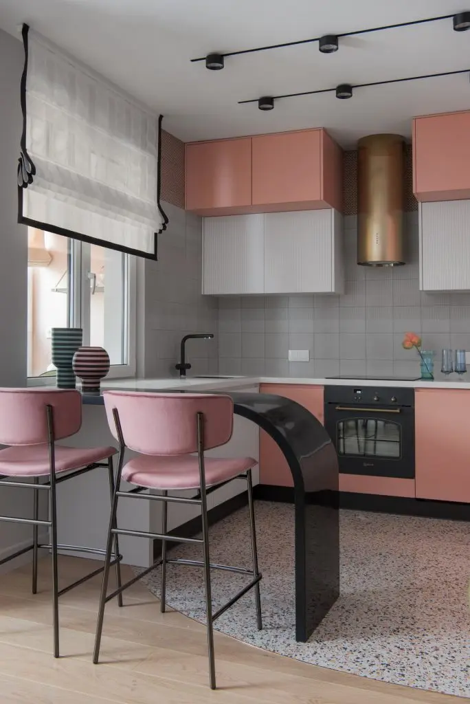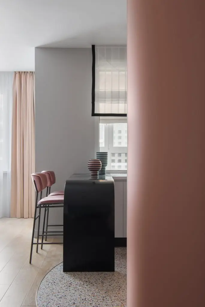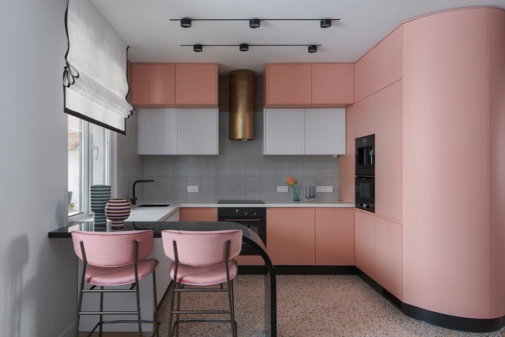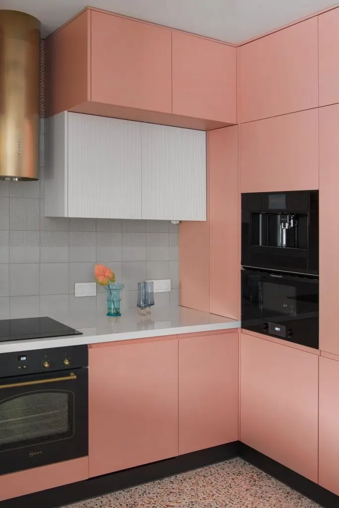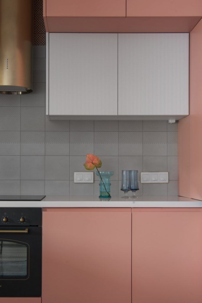 Echipa de arhitecti povesteste ca selectia nuantei potrivite de roz pentru fronturile mobilierului de bucatarie a durat foarte mult; au fost facute mai multe simulari si incercari inainte de aprobarea variantei finale.