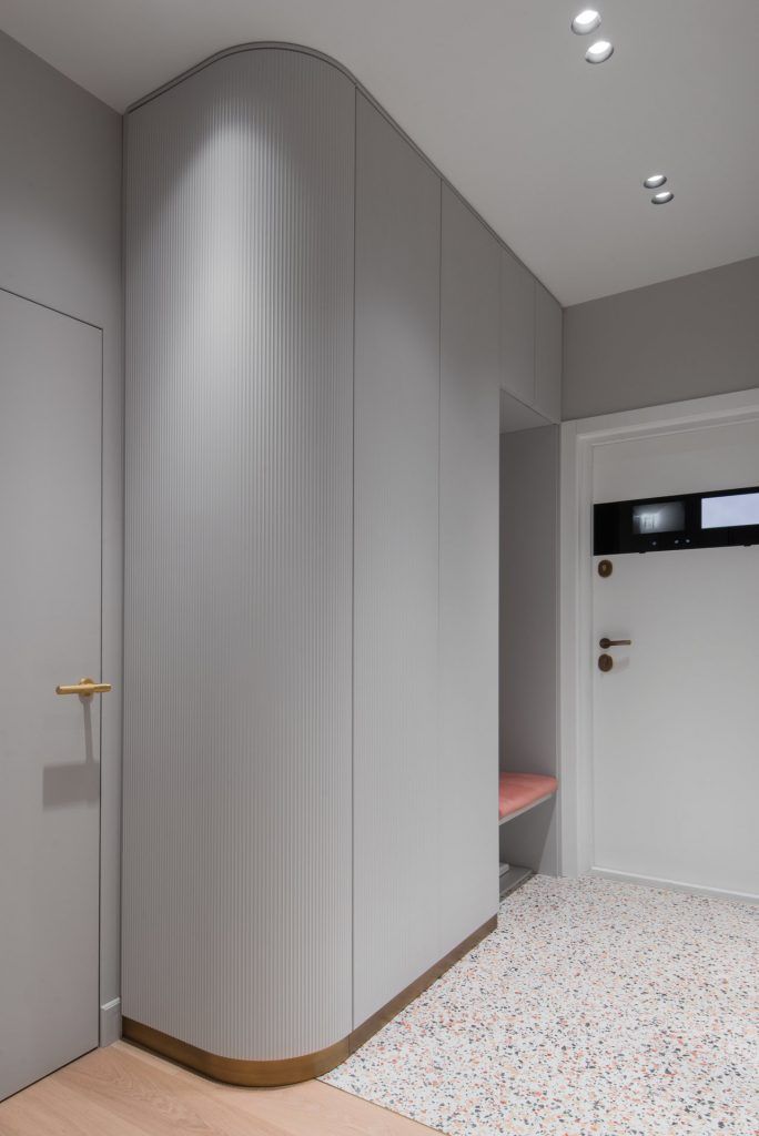 Totodata, a fost eliminata zona de dressing propusa de dezvoltatorul imobilului; arhitectii au optat pentru o repartizare echilibrata a spatiilor de depozitare in intreaga locuinta. Fiecare metru patrat disponibil a fost valorificat la maxim pentru a asigura confortul necesar. Majoritatea pieselor de mobilier a fost realizata la comanda, pentru a se potrivi perfect atat dimensiunilor disponibile cat si conceptului propus.