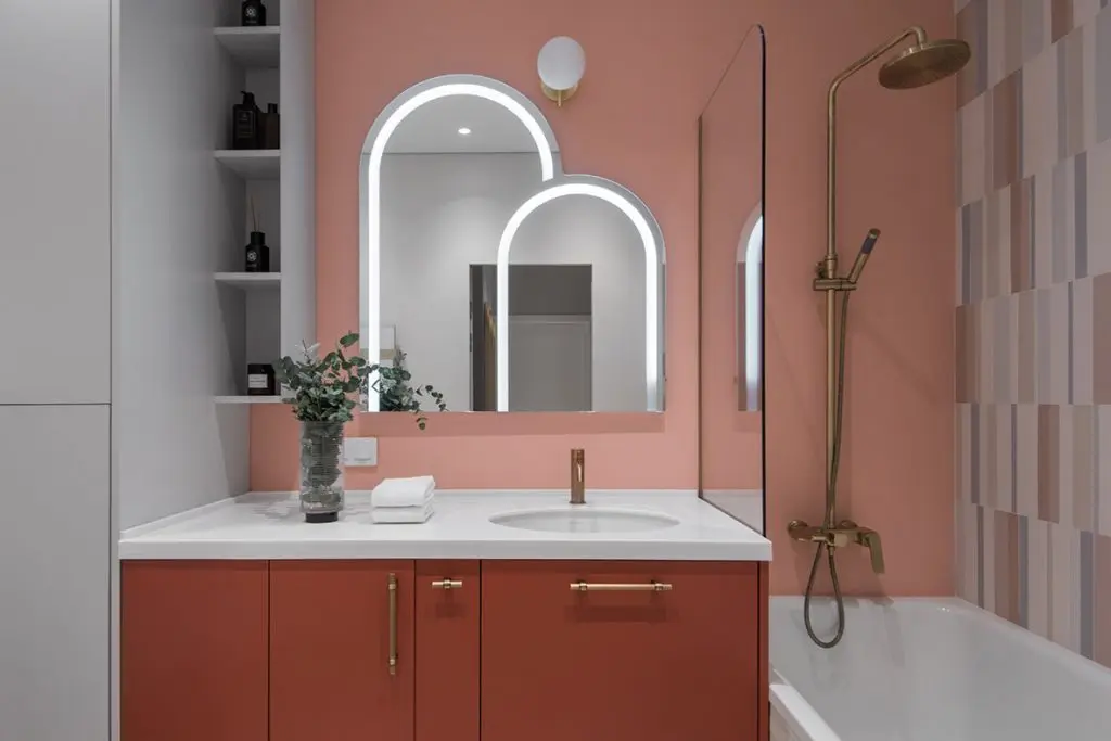 In amenajarea baii, clienta si-a dorit sa inlocuiasca dusul existent cu o cada, ceea ce s-a implementat cu succes. Masina de spalat rufe este mascata ingenios intr-un corp de depozitare inalt , extrem de util. Regasim si in baie prelungirea conceptului arcelor, folosite la compozitia de oglinzi de pe perete.