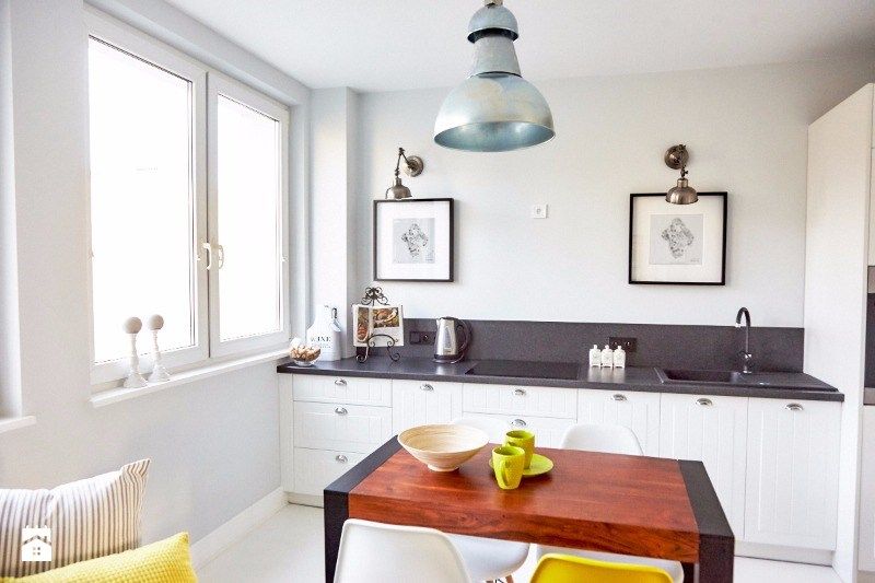 Astfel, in locul lor vom gasi 2 tablouri cu 2 lampi aferente pentru un iluminat de accent. Pentru a realiza un usor contrast cu fundalul predominant de alb, blatul de lucru si o mica portiune din perete sunt dintr-un material compozit gri.