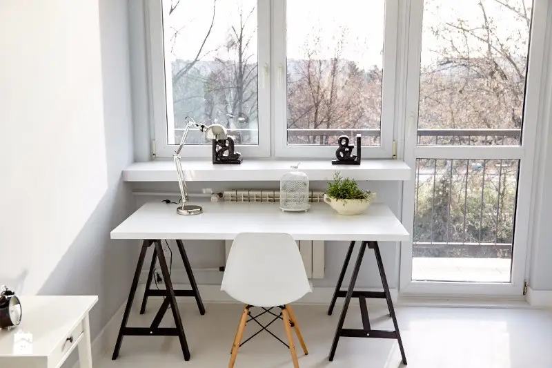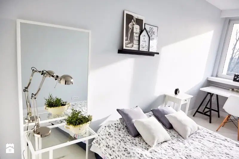 Pentru dormitor, designerul a ales sa continue tema minimalista inceputa in living. Patul si o noptiera alaturi de un birou amenajat la fereastra compun in linii mari decorul dormitorului. Micile decoratiuni sunt binevenite pentru un strop de personalitate. Vei remarca ca la ferestre nu sunt perdele sau draperii. Aici este o optiune personala.
