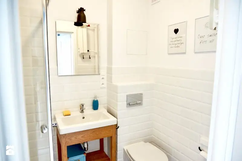As alege un model simplu, tot pe alb care sa confere un strop de intimitate, mai ales in dormitor. Ca depozitare, in hol a fost incastrat un dulap cu o usa tip oblon. Designul din baie pastreaza aceeasi nota minimalista, cu mult alb. Cadrul din lemn pe care se sprijina lavoarul da foarte bine in contextul acestei bai minimaliste.