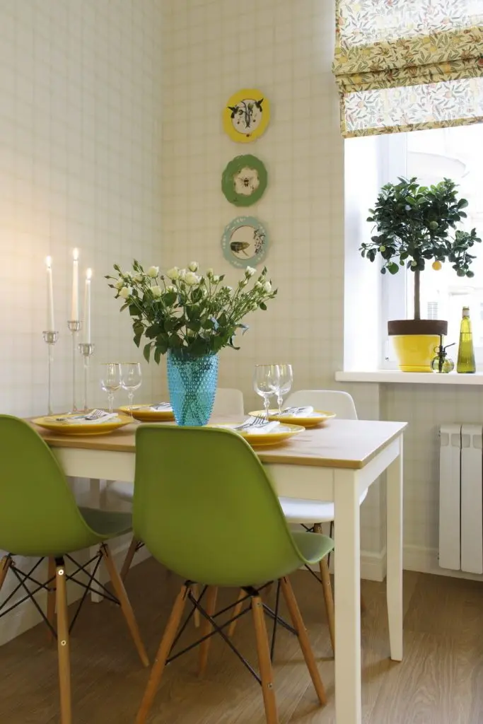 Intalnim mult verde sub diferite nuante, echilibrat de tuse de galben si alb sau crem.