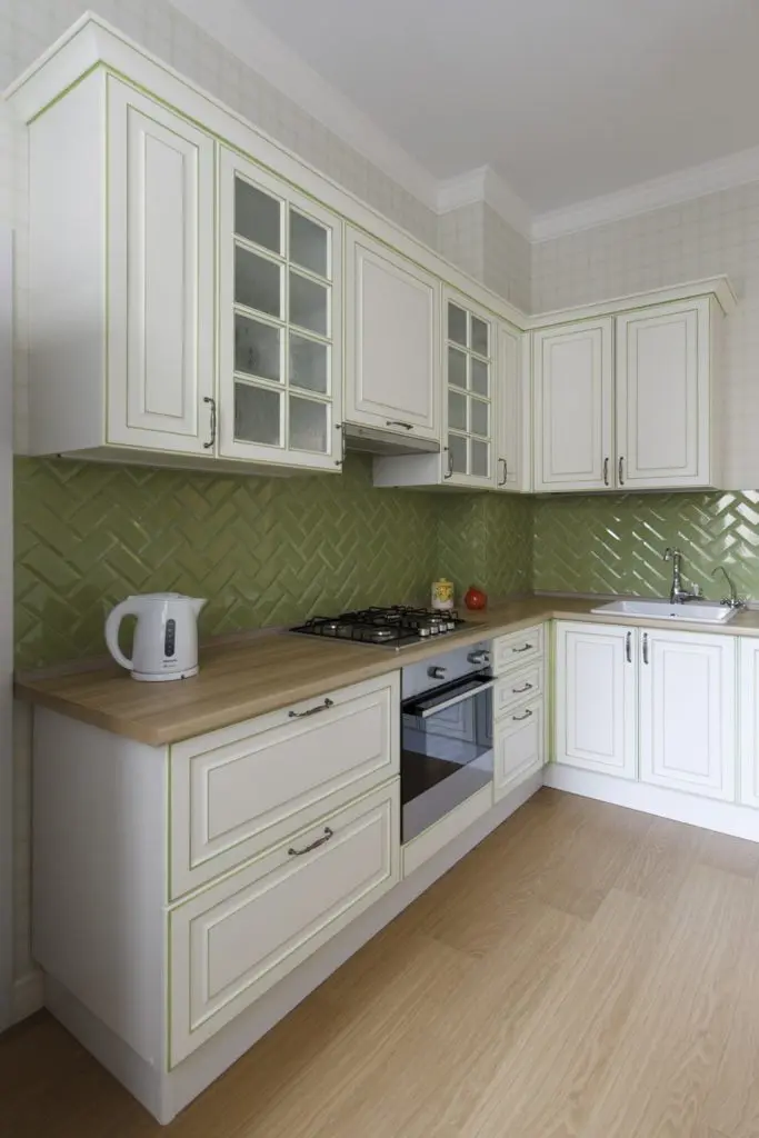 Suprafata bucatariei nu este una tocmai generoasa, insa suficienta pentru a putea dezvolta o amenajare functionala, cu spatii pentru gatit si depozitare. Mobilierul vine cu un design de inspiratie clasica, cu insertii foarte discrete de verde. Braul dintre corpurile superioare si cele inferioare atrage atentia prin culoare si prin dispunerea placilor de faianta.