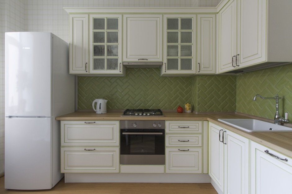 Suprafata bucatariei nu este una tocmai generoasa, insa suficienta pentru a putea dezvolta o amenajare functionala, cu spatii pentru gatit si depozitare. Mobilierul vine cu un design de inspiratie clasica, cu insertii foarte discrete de verde. Braul dintre corpurile superioare si cele inferioare atrage atentia prin culoare si prin dispunerea placilor de faianta.