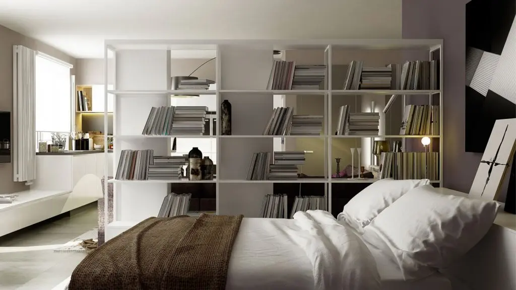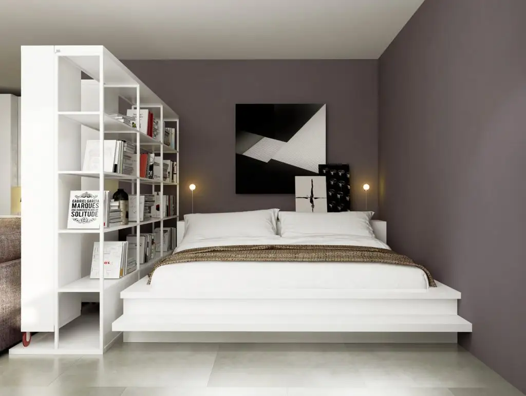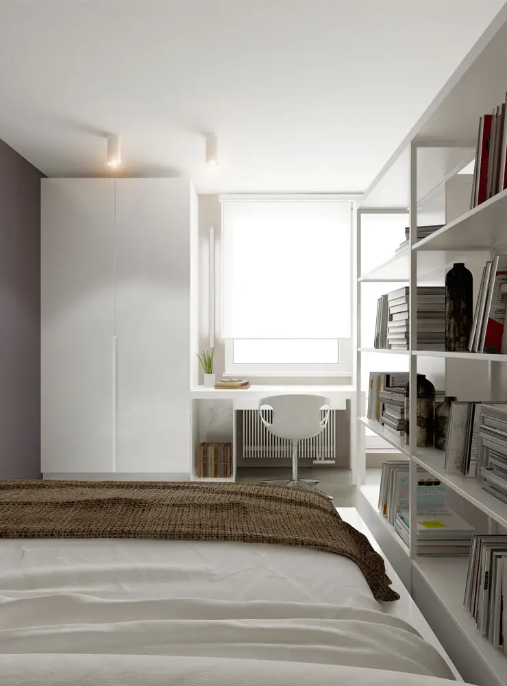 Spatiul pentru dormit a fost creat in spatele unui corp de biblioteca alb, o parte din rafturi fiind deschise; solutia gasita este una ideala pentru a separa functiunile zonelor de zi si noapte intr-un spatiu mic. Culoarea peretilor este o alegere minunata, relaxanta, potrivita pentru un dormitor, iar albul cadrului, precum si al bibliotecii separatoare completeaza armonios alegerea cromatica.