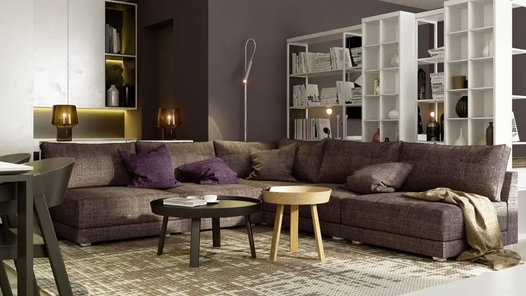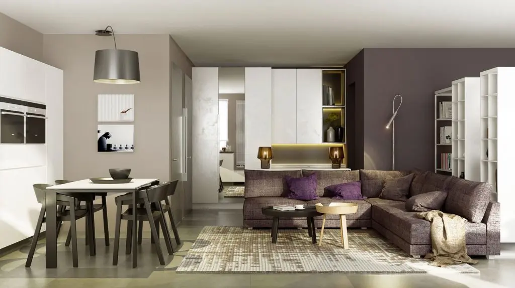 Astfel, peretii in nuante deschise si mobilierul alb, lucios reflecta lumina si amplifica spatiul, iar tonurile de mov confera profunzime si eleganta.