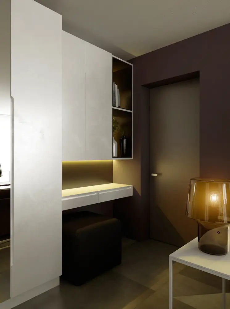 Fiecare zona din aceasta amenajare isi are propriul sistem de depozitare; pornind de la bucatarie, spre hol, cu un dulap voluminos, apoi spre biblioteca si terminand in zona de dormit cu o tablie de pat ce permite stocarea lenjeriei. Un blat asezat la fereastra functioneaza pe post de birou.