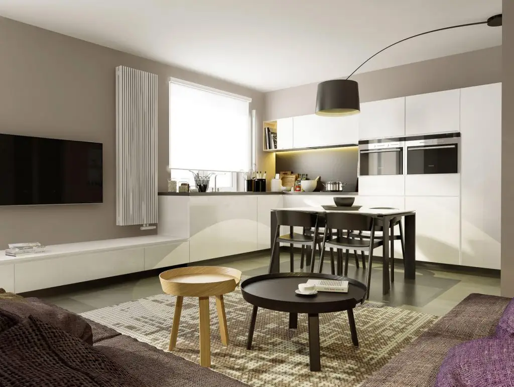 Zona de zi este foarte bine valorificata. Pornind de la o bucatarie compacta, cu electrocasnice incastrate, care se continua subtil printr-o comoda din acelasi material, trecem spre zona de living cu televizor, o canapea in forma de L ce joaca si un rol delimitator.
