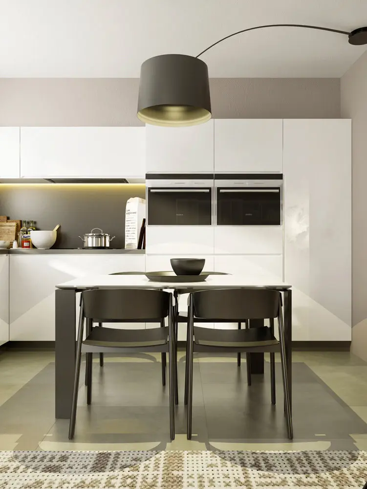 Legatura intre cele 2 se face prin locul de luat masa, marcat la nivelul decorului printr-un corp de iluminat ce seamana mai degraba cu un lampadar. Masa si scaunele negre creeaza un contrast placut cu albul mobilierului de bucatarie.