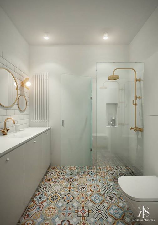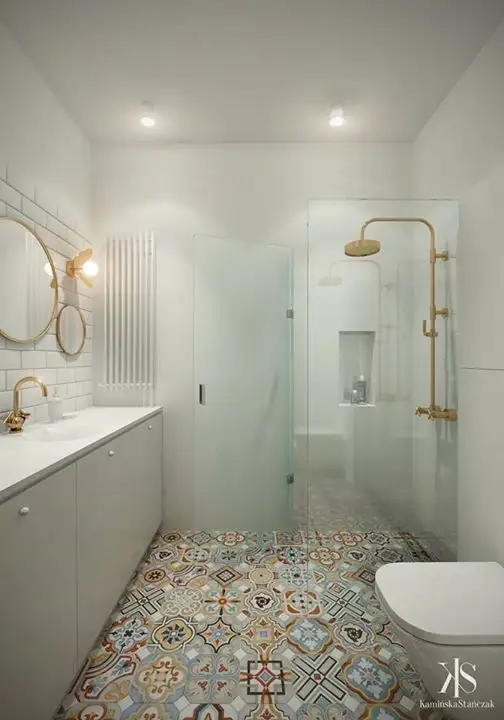 In baie predomina albul, pardoseala cu modelul tip mozaic fiind piesa de rezistenta.