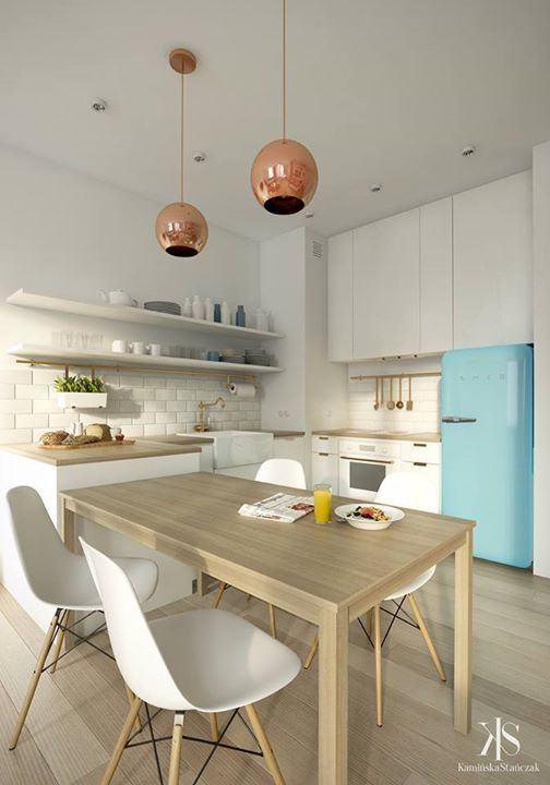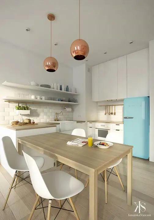 Zona dedicata bucatariei o amenajare compacta, aerisita in care frigiderul aduce o pata de culoare