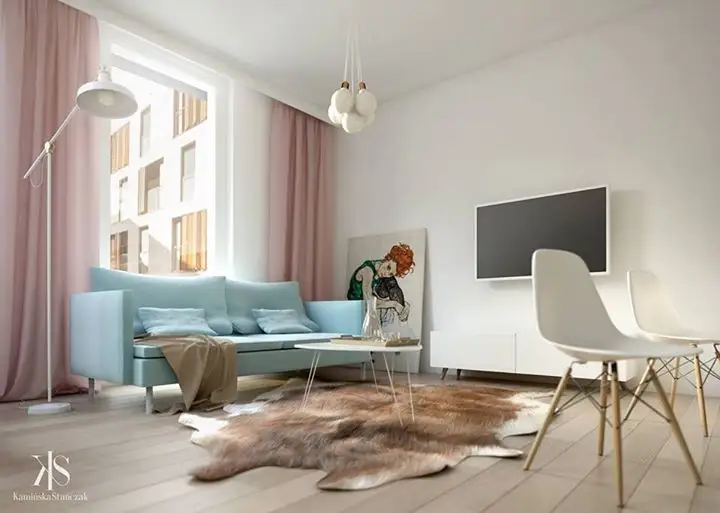 Zona mini-livingului cuprinde canapeaua, intr-un bleu pastelat si draperiile roz care intregesc o atmosfera boema. O masuta de cafea cu picioare subtiri aproape invizibile completeaza discret restul spatiului.