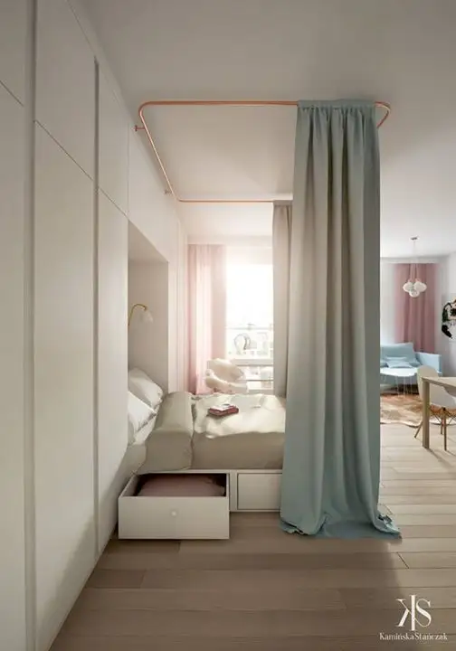 Patul este inteligent integrat in spatiul unei biblioteci deschise, de o parte si cealalta existand draperii lungi, care ascund zona destinata odihnei. De o parte si de cealalta, vom gasi dulapuri care satisfac nevoia pentru depozitare.