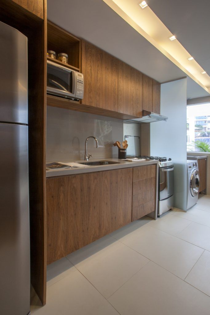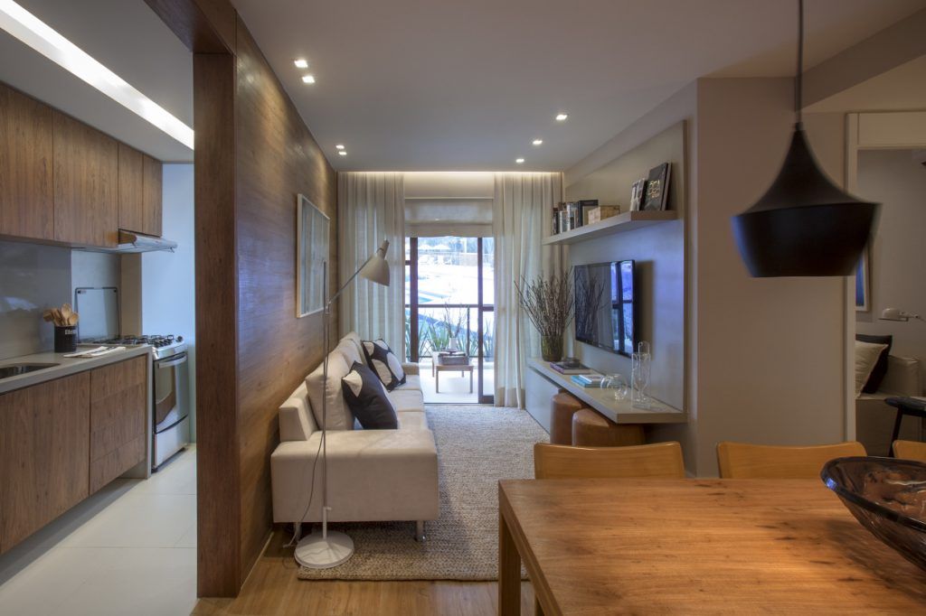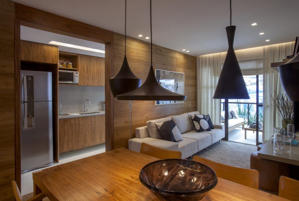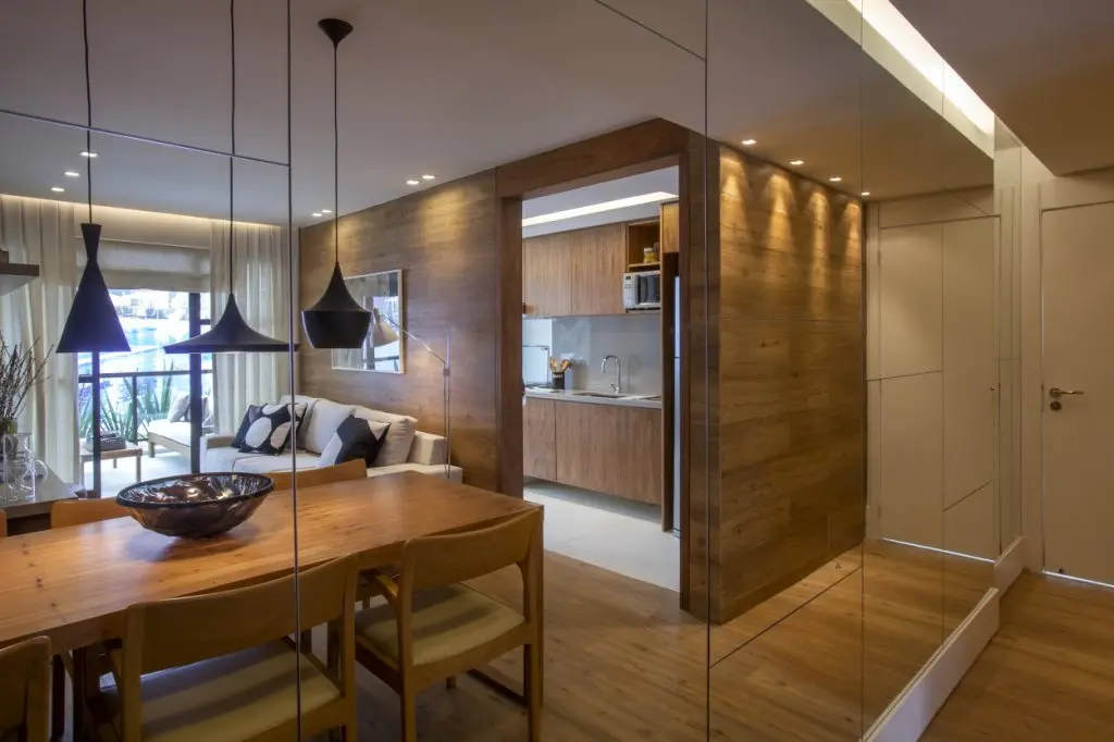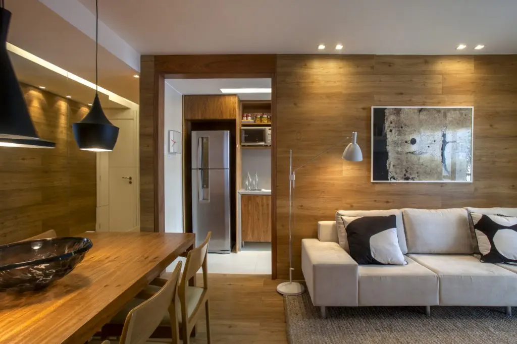 Cromatica predominanta este una neutra, iar lemnul joaca rolul principal. Esentele de stejar se regasesc unitar atat pe peretele placat din living, cat si la nivelul mesei, scaunelor sau al mobilierul bucatariei. Se asigura astfel o continuitate menita sa estompeze din limitarile spatiale.