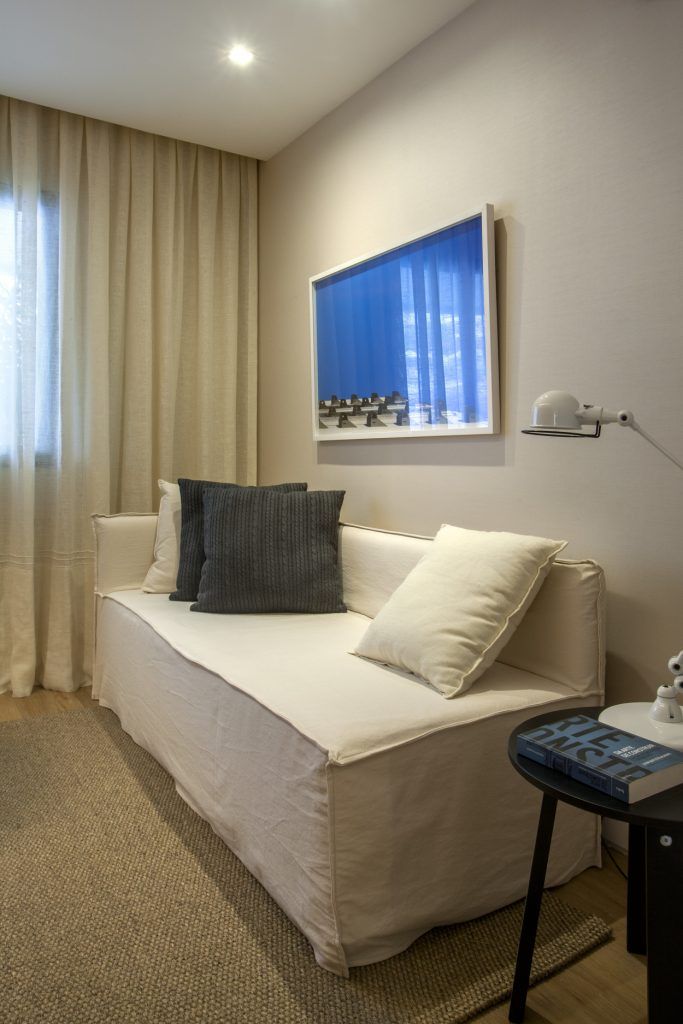 Pentru living s-au ales doar piese de mobilier strict necesare. Canapeaua asezata la perete, iar pe cel opus, a fost gandit un panou cu 2 etajere, iar in mijloc pozitionat televizorul. Alegand un astfel de corp (vezi si inaltimea) s-a putut crea spatiu pentru 2 scaune tip otoman perfect integrabile sub etajera.