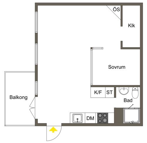 Zona destinata gatitului este dispusa pe o singura latura, cu un mobilier simplu si design liniar. Electrocasnicele sunt incorporate pentru a pastra aspectul de ordonat si unitar. Pe latura opusa a fost incastrat frigiderul si un alt dulap care sporeste zonele de depozitare din garsoniera.