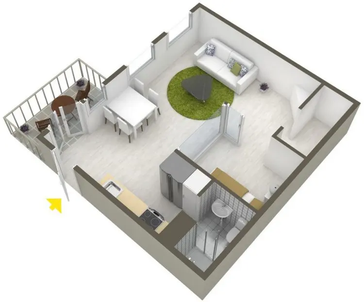 Spatiul nu este unul generos, insa toate detaliile necesare unui locuit confortabil au fost bine integrate in perimetrul disponibil. Zona de living, loc pentru luat masa, bucatarie si un mic dormitor amenajat intr-o nisa. Exista si un dressing, aproape ca o incapere, unde se afla amenajata principala zona de depozitare a casei.