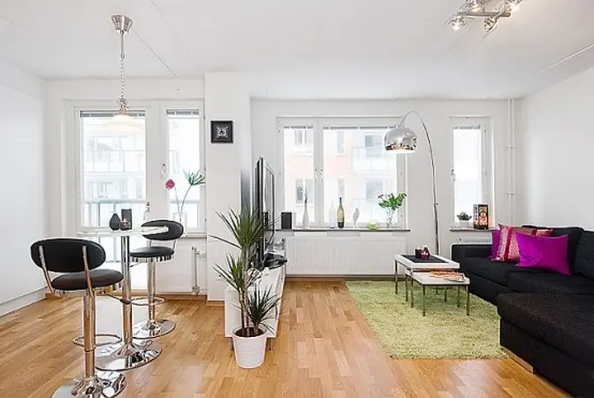 Accentele de verde si mov vin ca pete de culoare fresh. Am putea spune chiar ca verdele este un laitmotiv prin plantele, covorul verde si pernele decorative in nuante asemanatoare. Fiind o amenajare cu influente preponderent nordice, plantele sunt nelipsite din amenajare. Detaliile decorative imbraca frumos spatiul, oferind acea nota de personalitate care diferentiaza fiecare locuinta in parte.