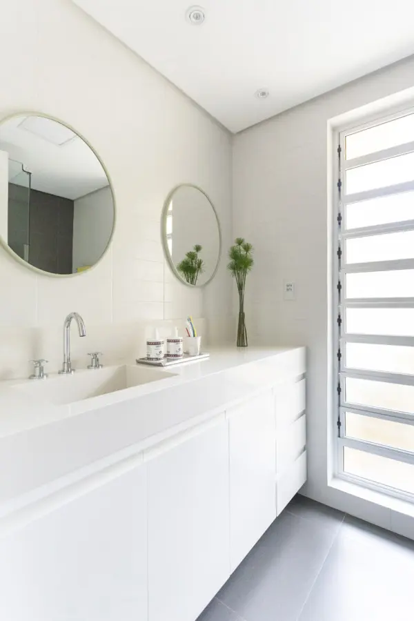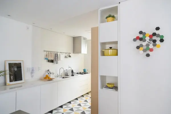 Bucataria alba a primit propria doza de culoare in aceasta amenajare, transpusa in bucatile de gresie asezate intr-un pattern geometric in nuante de gri, galben, alb si negru.