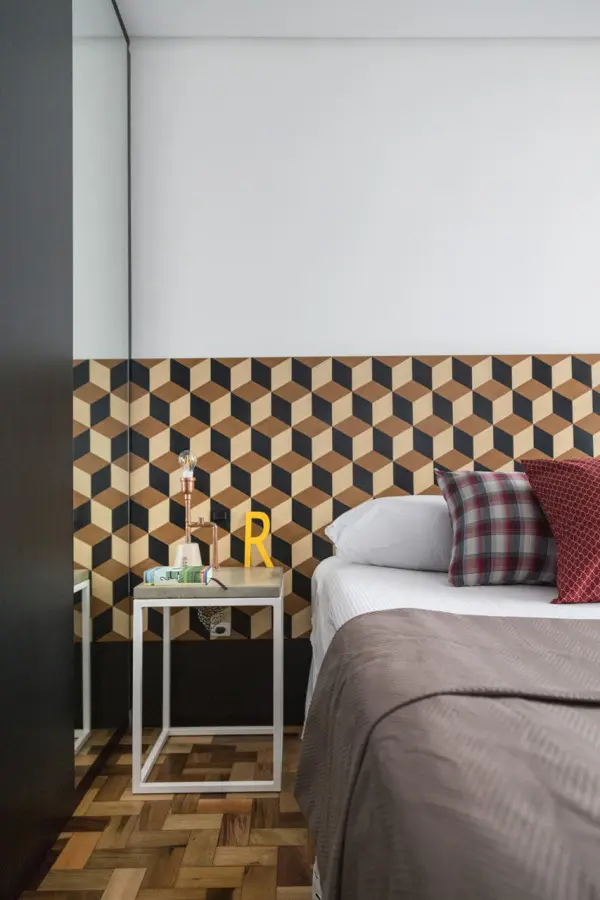 Dormitorul matrimonial este marcat de patternul geometric in culori calde care contrasteaza cu monotonia din cromatica acestei incaperi.