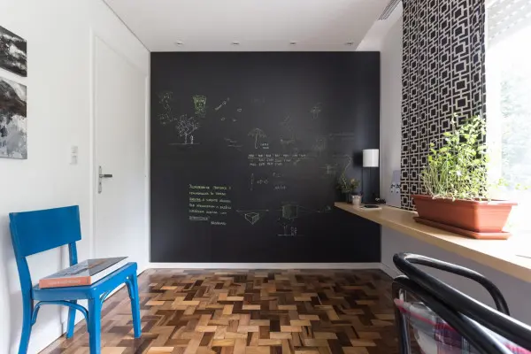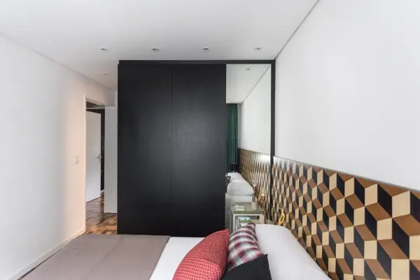 Biroul si camera pentru oaspeti impart aceeasi incapere, iar zona pentru depozitare a fost adaptata ambelor functii ale camerei. Dormitorul matrimonial este marcat de patternul geometric in culori calde care contrasteaza cu monotonia din cromatica acestei incaperi. Parchetul din lemn masiv construit din placi inguste adauga eleganta apartamentului si confera o nota calda intregii atmosfere.