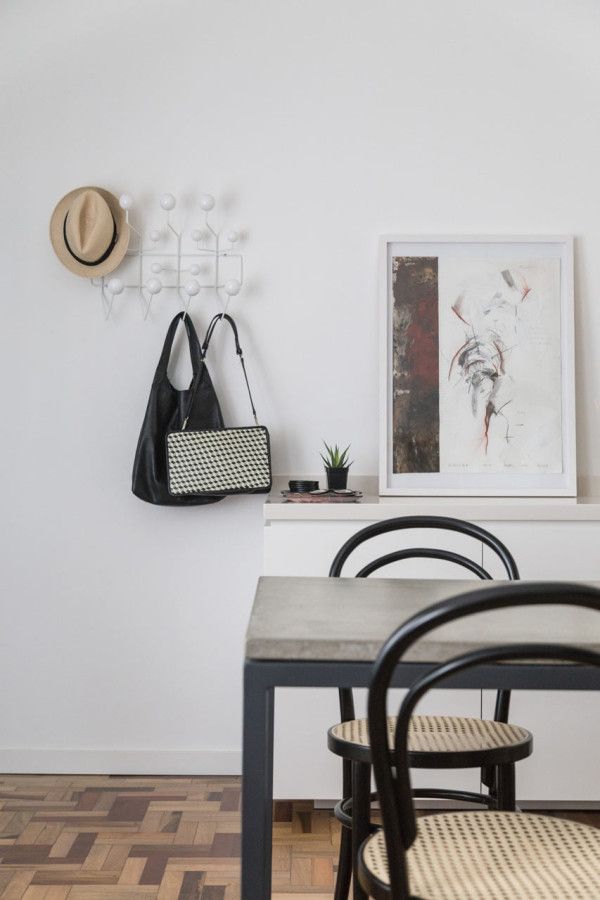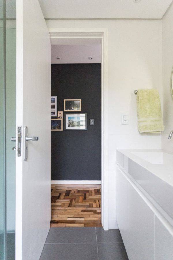 Biroul si camera pentru oaspeti impart aceeasi incapere, iar zona pentru depozitare a fost adaptata ambelor functii ale camerei. Dormitorul matrimonial este marcat de patternul geometric in culori calde care contrasteaza cu monotonia din cromatica acestei incaperi. Parchetul din lemn masiv construit din placi inguste adauga eleganta apartamentului si confera o nota calda intregii atmosfere.