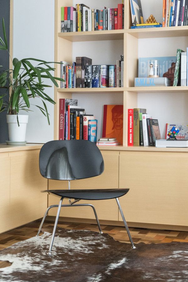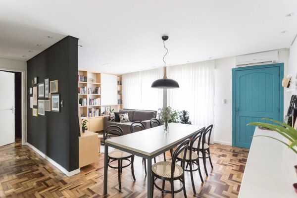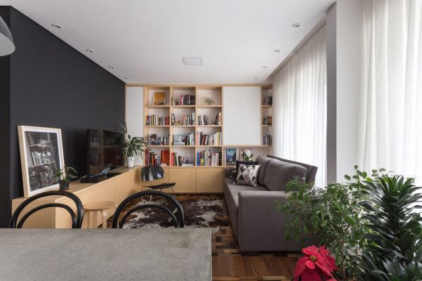 In living isi fac prezenta doi pereti utilizati intr-un mod interesant in aceasta amenajare. Peretele vopsit in negru functioneaza ca suport pentru T V si marcheaza holul de trecere catre dormitoare, in timp ce peretele perpendicular sustine biblioteca din lemn care cuprinde colectia de carti a cuplului.