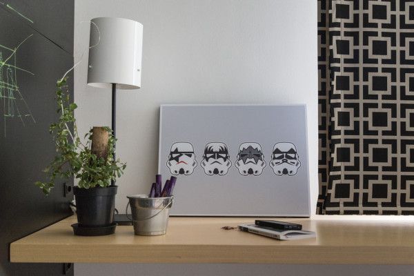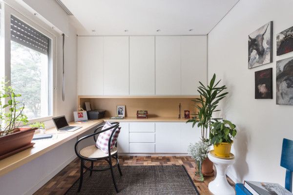 Biroul si camera pentru oaspeti impart aceeasi incapere, iar zona pentru depozitare a fost adaptata ambelor functii ale camerei.