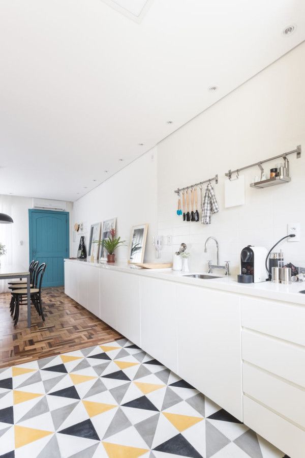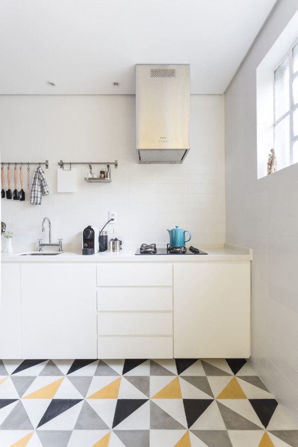 Bucataria alba a primit propria doza de culoare in aceasta amenajare, transpusa in bucatile de gresie asezate intr-un pattern geometric in nuante de gri, galben, alb si negru.
