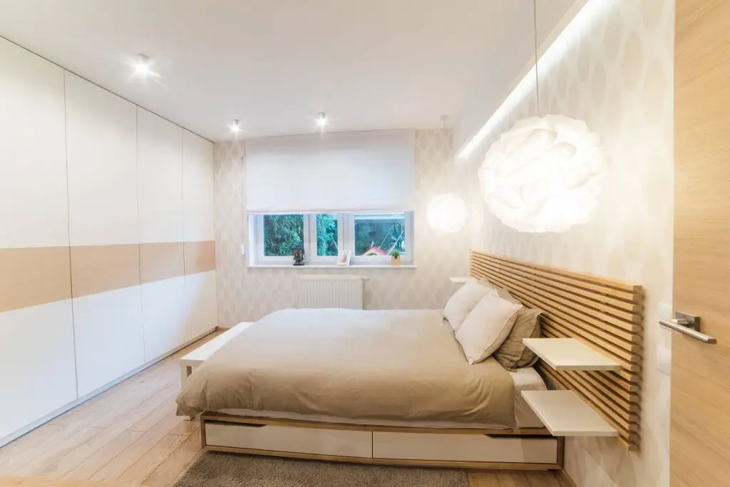Optimizarea este cu atat mai vizibila in dormitorul matrimonial. Pe un intreg perete a fost dispus un dulap care asigura o zona ampla pentru pastrarea hainelor. Se pastreaza stilul simplu, dar modern, iar designerii au reusit sa pastreze o senzatie de luminozitate amplificata de albul predominant al dulapurilor si lemnul de stejar deschis la culoare al patului sau al tabliei patului.