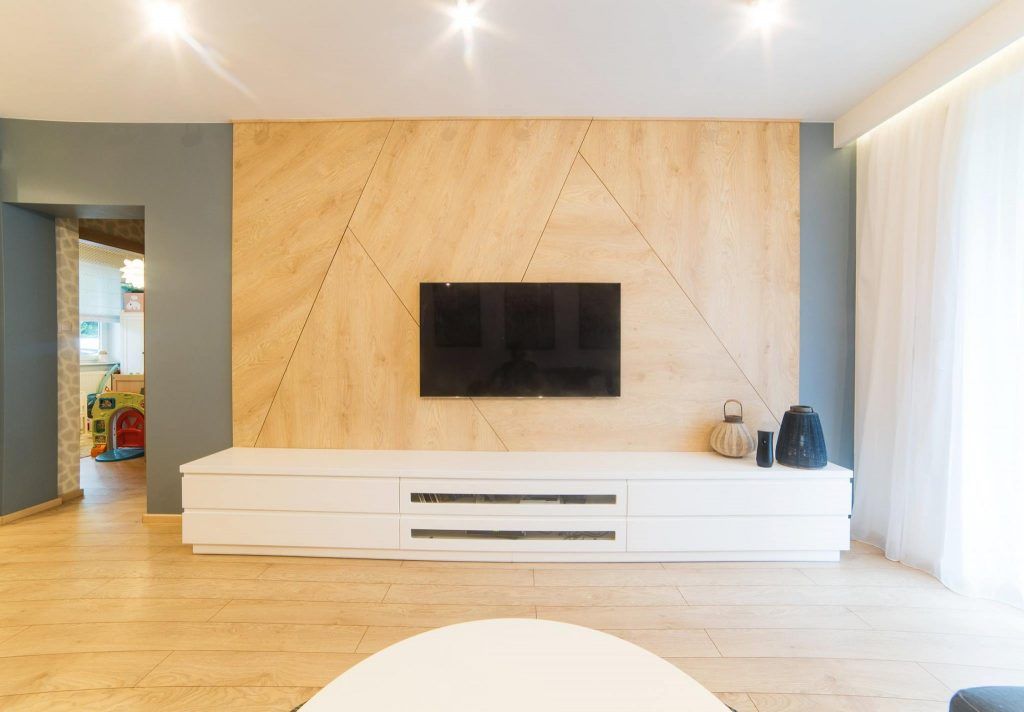 In plus, au fost creati doi pereti-accent utilizand tablouri cu tematica geometrica in contrast cu piesa-statement, un panou din lemn realizat prin imbinarea mai multor placi cu forme geometrice.
