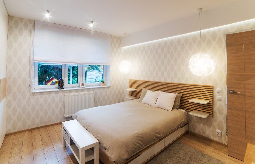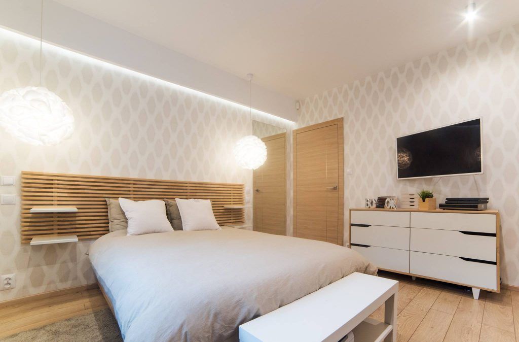 Optimizarea este cu atat mai vizibila in dormitorul matrimonial. Pe un intreg perete a fost dispus un dulap care asigura o zona ampla pentru pastrarea hainelor. Se pastreaza stilul simplu, dar modern, iar designerii au reusit sa pastreze o senzatie de luminozitate amplificata de albul predominant al dulapurilor si lemnul de stejar deschis la culoare al patului sau al tabliei patului.